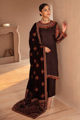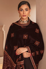 Elegant raw silk suit with detailed embroidery and velvet shawl